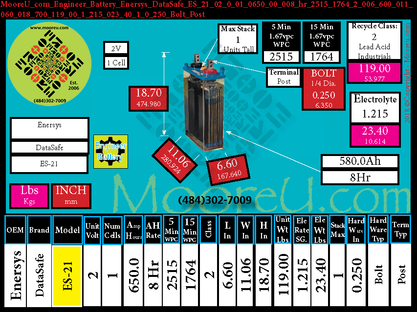 Each Unit , Enersys, DataSafe, ES 21, VPU=2,CPU=1, AH=650 008 hr, WPC 5min 1.67=2515, WPC 15min 1.67=1764, Class =Lead Acid Industrials, Len. =6.6in, Wid. =11.06in, Hht. =18.7in, Wht. =119 lbs, Rating =1 215, E. Weight =23.4 lbs, Stack =1,Term. Hard. =1/4, Hard. Type =Bolt, Term. Type=Post