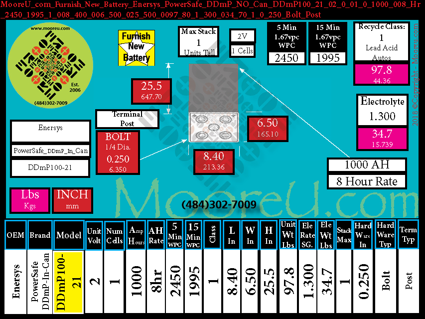 Each Unit , Enersys, PowerSafe DDmP NO Can, DDmP100 21, VPU=02,CPU=01, AH=1000 008 Hr, WPC 5min 1.67=2450, WPC 15min 1.67=1995, Class =Lead Acid Autos, Len. =8.4in, Wid. =6.5in, Hht. =25.5in, Wht. =97.8 lbs, Rating =1 300, E. Weight =34.7 lbs, Stack =1,Term. Hard. =1/4, Hard. Type =Bolt, Term. Type=Post
